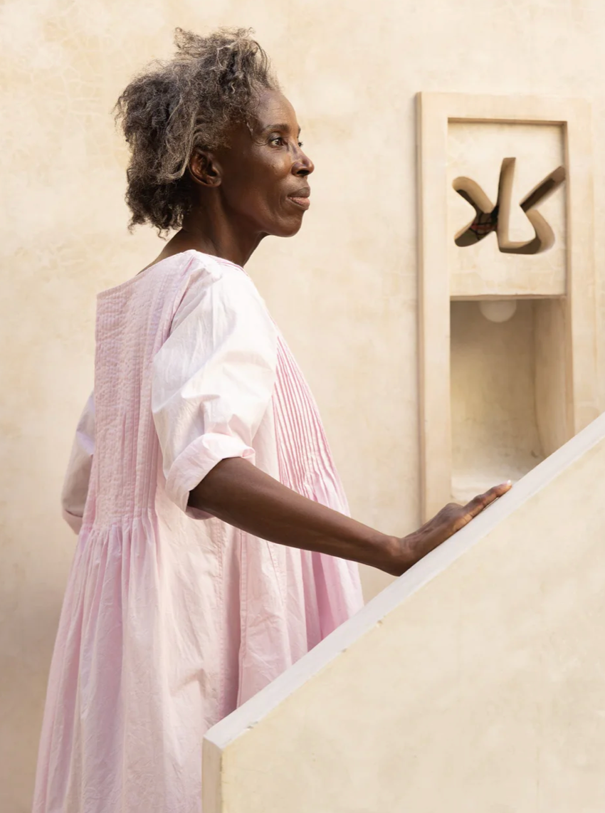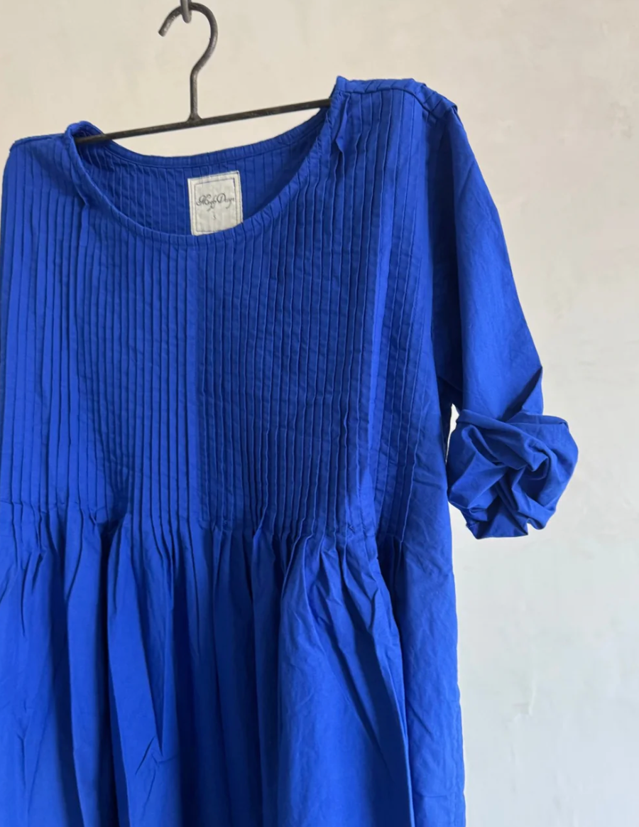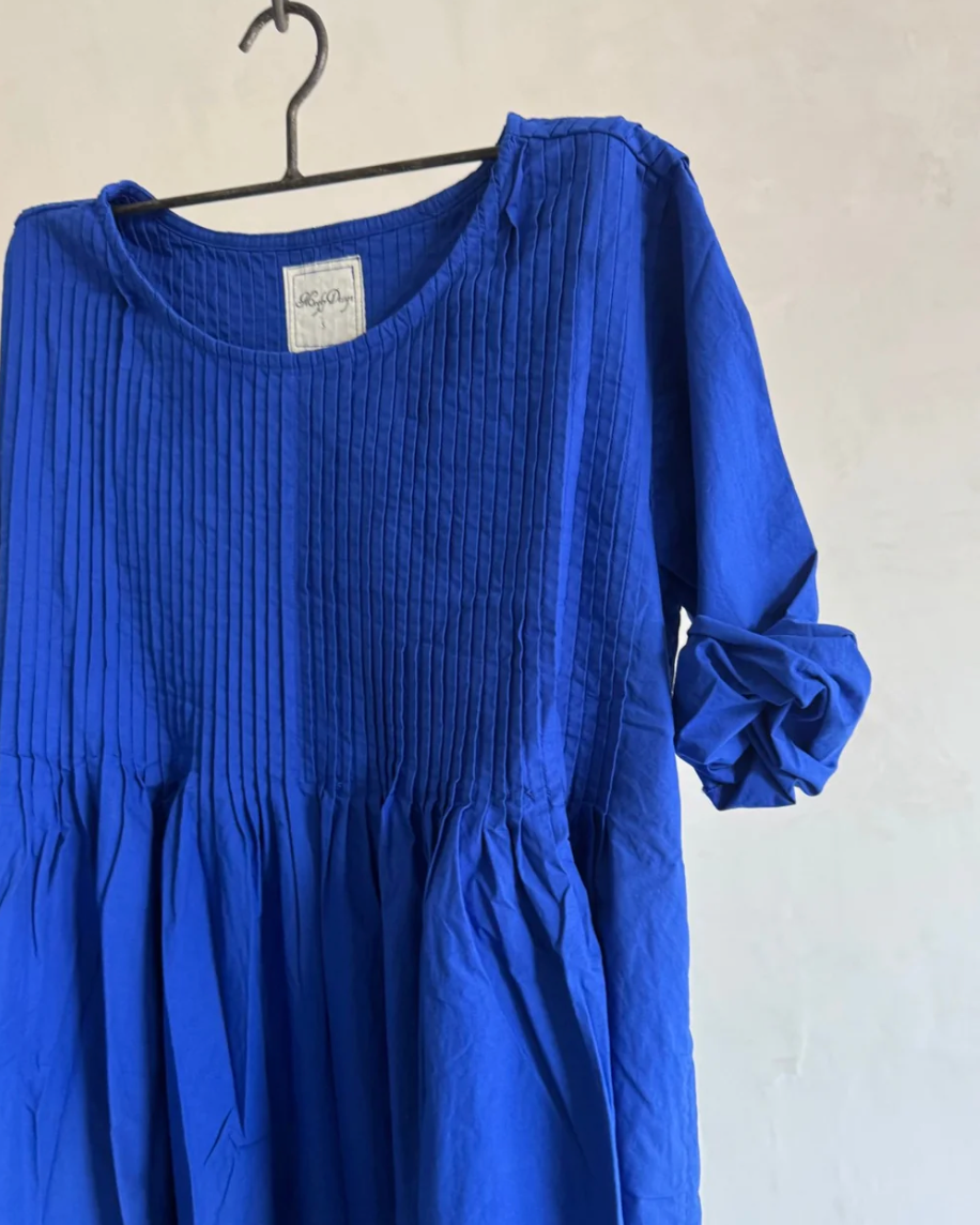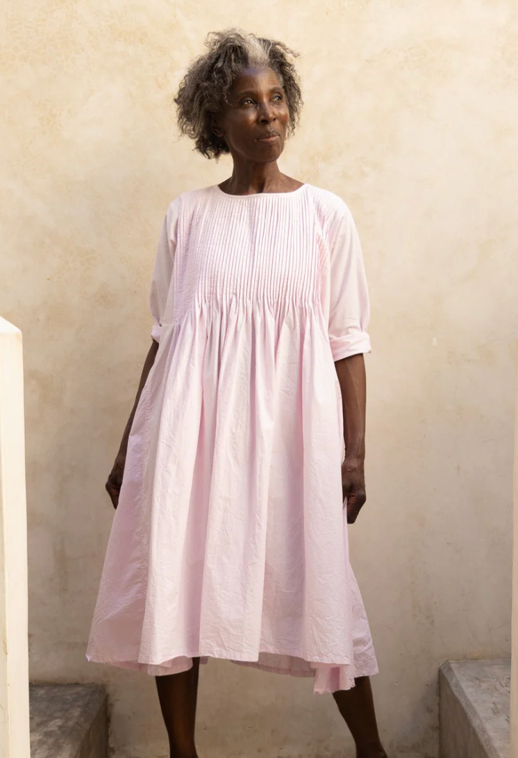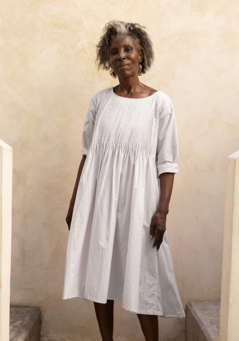 Asili Dress is made from a crisp, medium-weight cotton poplin that holds its shape while feeling soft, crisp and breathable against the skin. It features fine pintuck detailing along the front and back bodice, adding subtle structure and texture. The round neckline offers a balance of comfort and simplicity. Falling to a midi length, Asili is easy to layer or wear on its own.