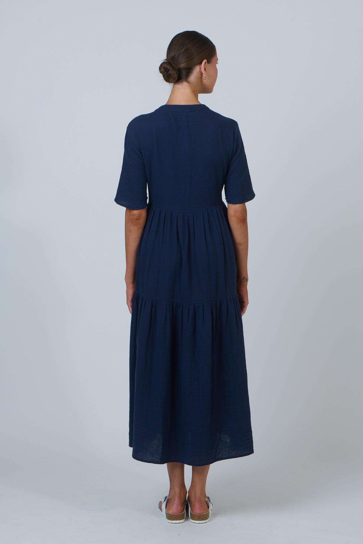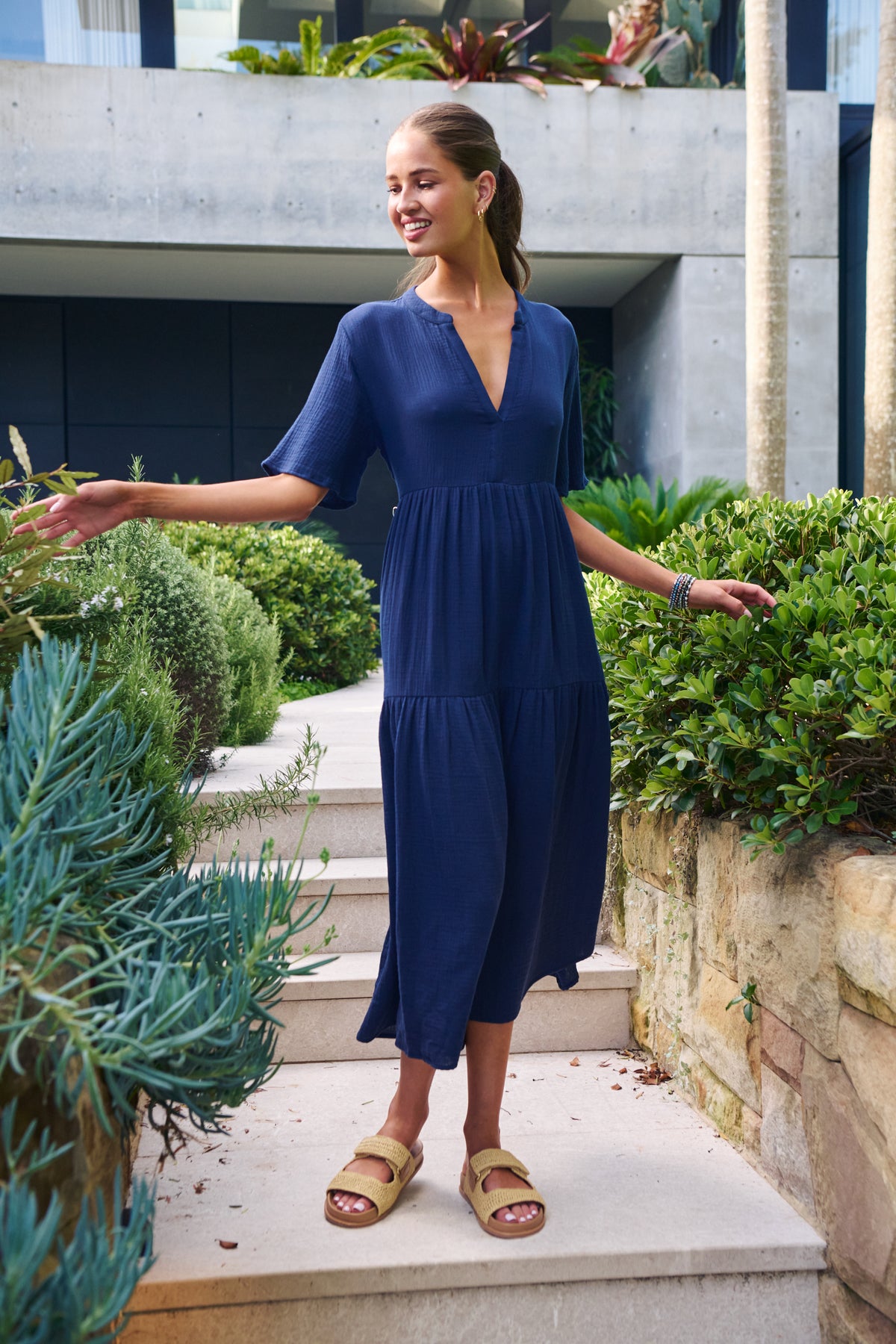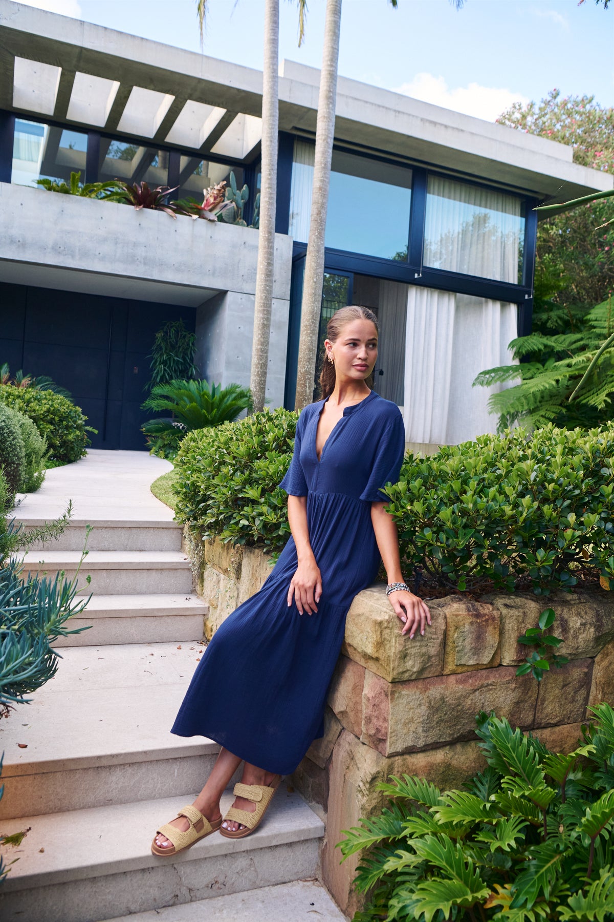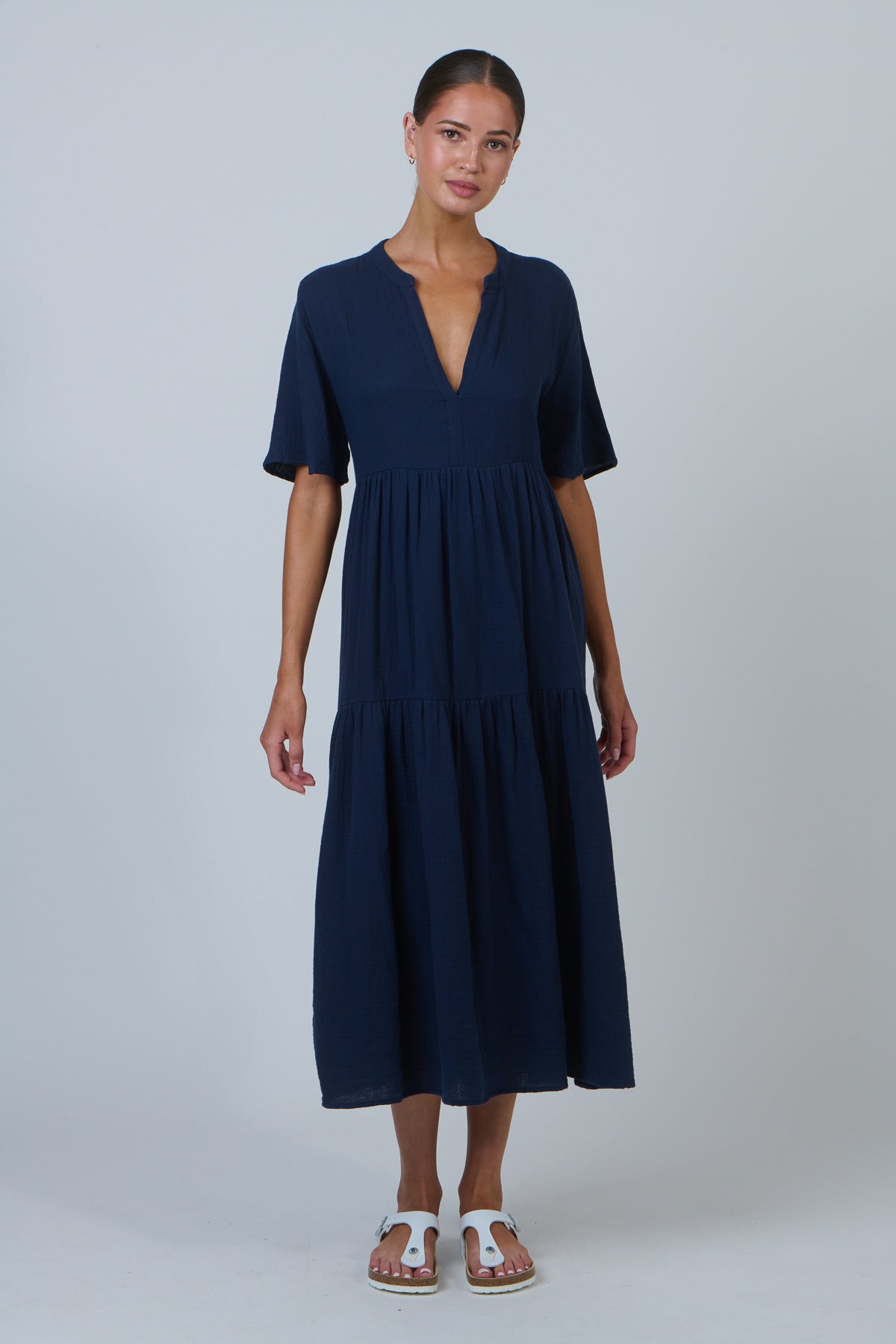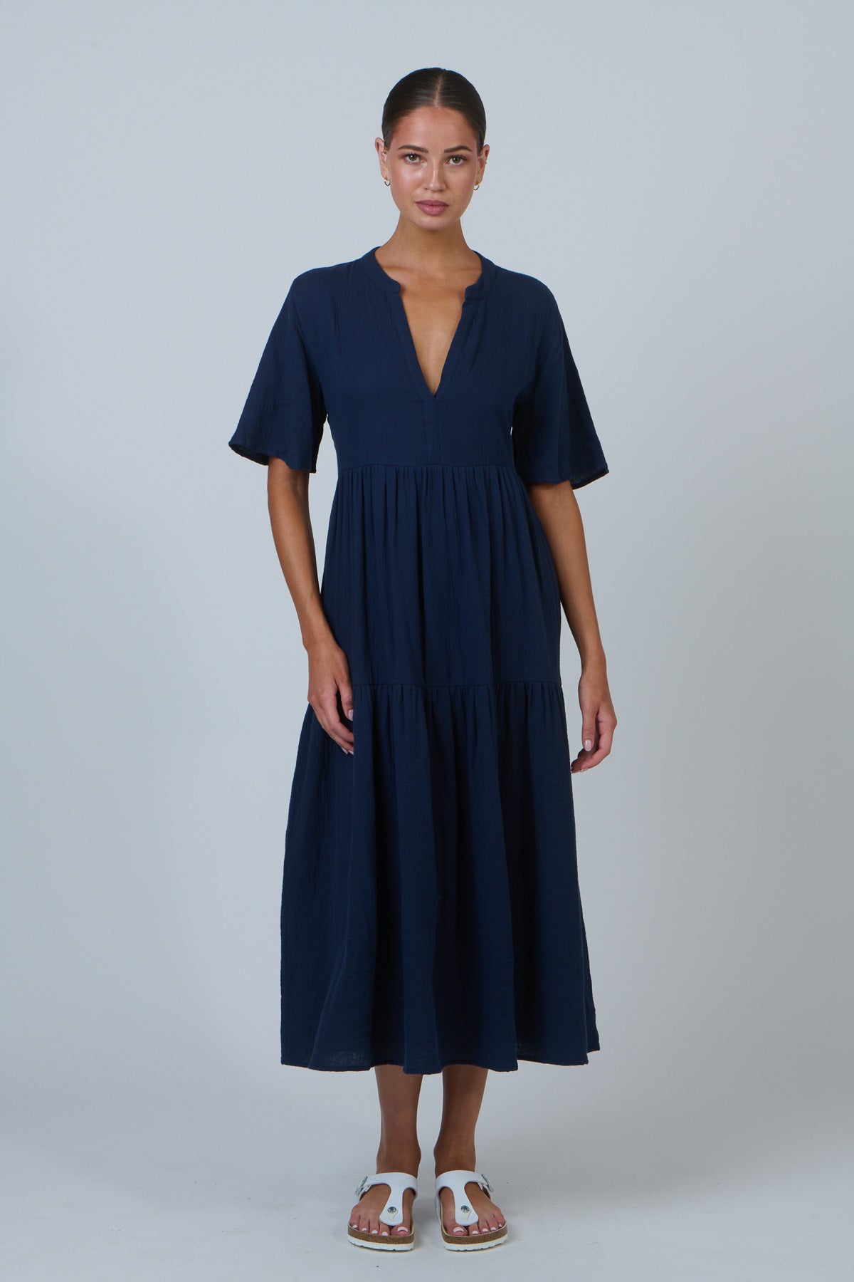 Clean lines, calm tones, and just the right length. This NAM69 tiered midi dress features a breezy silhouette with flutter sleeves, a flattering V-neckline, and a relaxed fit that gracefully skims the body. The lightweight 100% cotton fabric and minimalist design make it an effortless choice for warm weather occasions, easily dressed up or down.