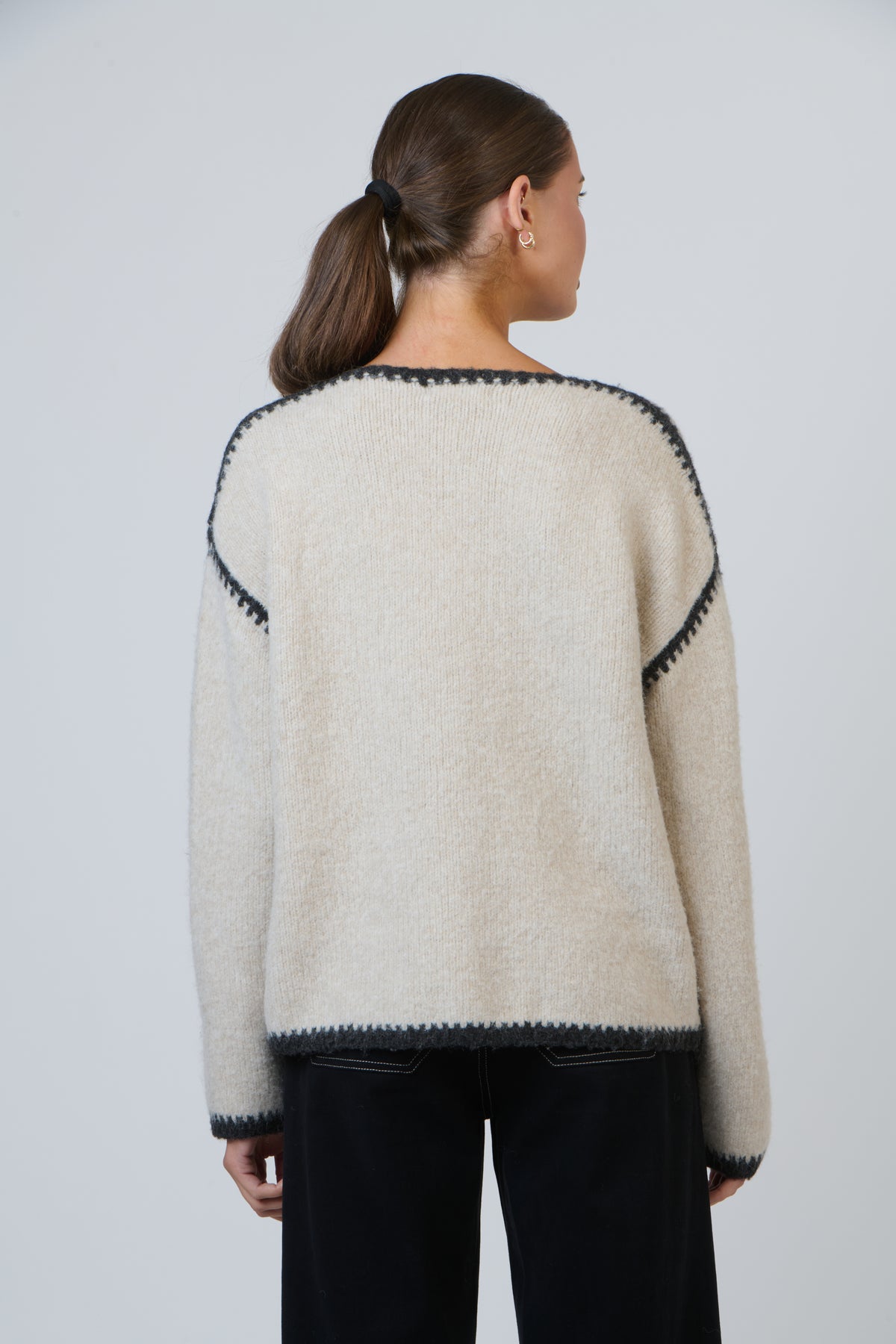 Bring subtle contrast and soft comfort together with the NAM-W20. Featuring a plush brushed knit and refined colour-block trim, this crew neck jumper offers relaxed structure with a gently oversized silhouette. Diagonal shoulder stripes and bold ribbed cuffs add modern character to its minimalist design. Finished with a contrast neckline and hem, it transitions seamlessly from casual to smart-casual styling.