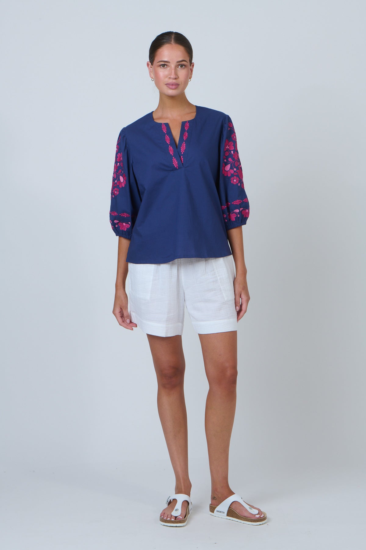 Ink blouse stands out with intricate embroidery set against a deep navy base. A split neckline and three-quarter balloon sleeves adorned with delicate floral details add just the right touch of softness. Style it with the crisp white shorts or dress it up with skirts or tailored trousers, an easy choice for days that call for a little extra.