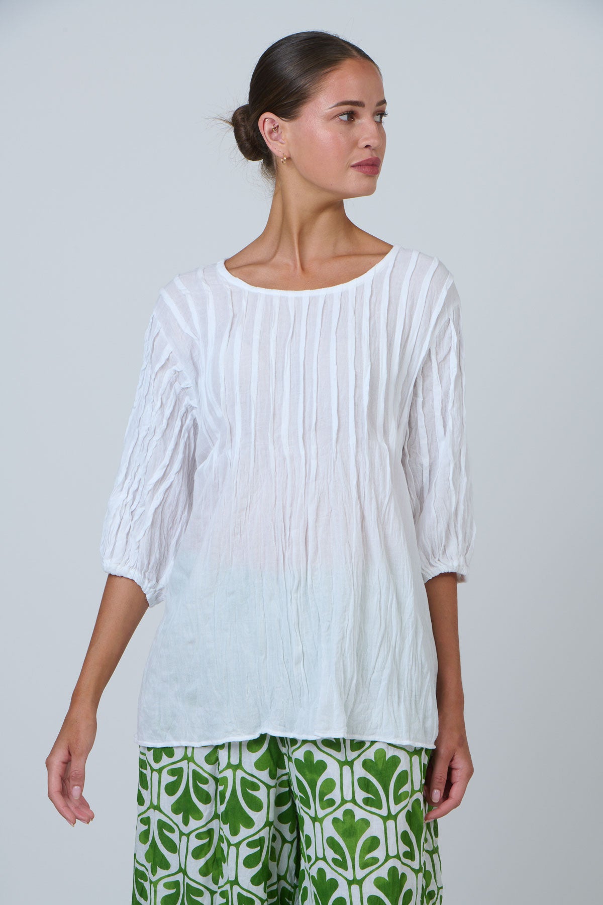 Pretty white top brings texture to the forefront with its distinctive 100% crinkle cotton fabric, creating natural pleats that move with you. Designed with a relaxed silhouette, boat neckline, and gently gathered three-quarter balloon sleeves, it’s a light, easy layer that works year-round—whether worn solo or styled with your favourite outerwear.