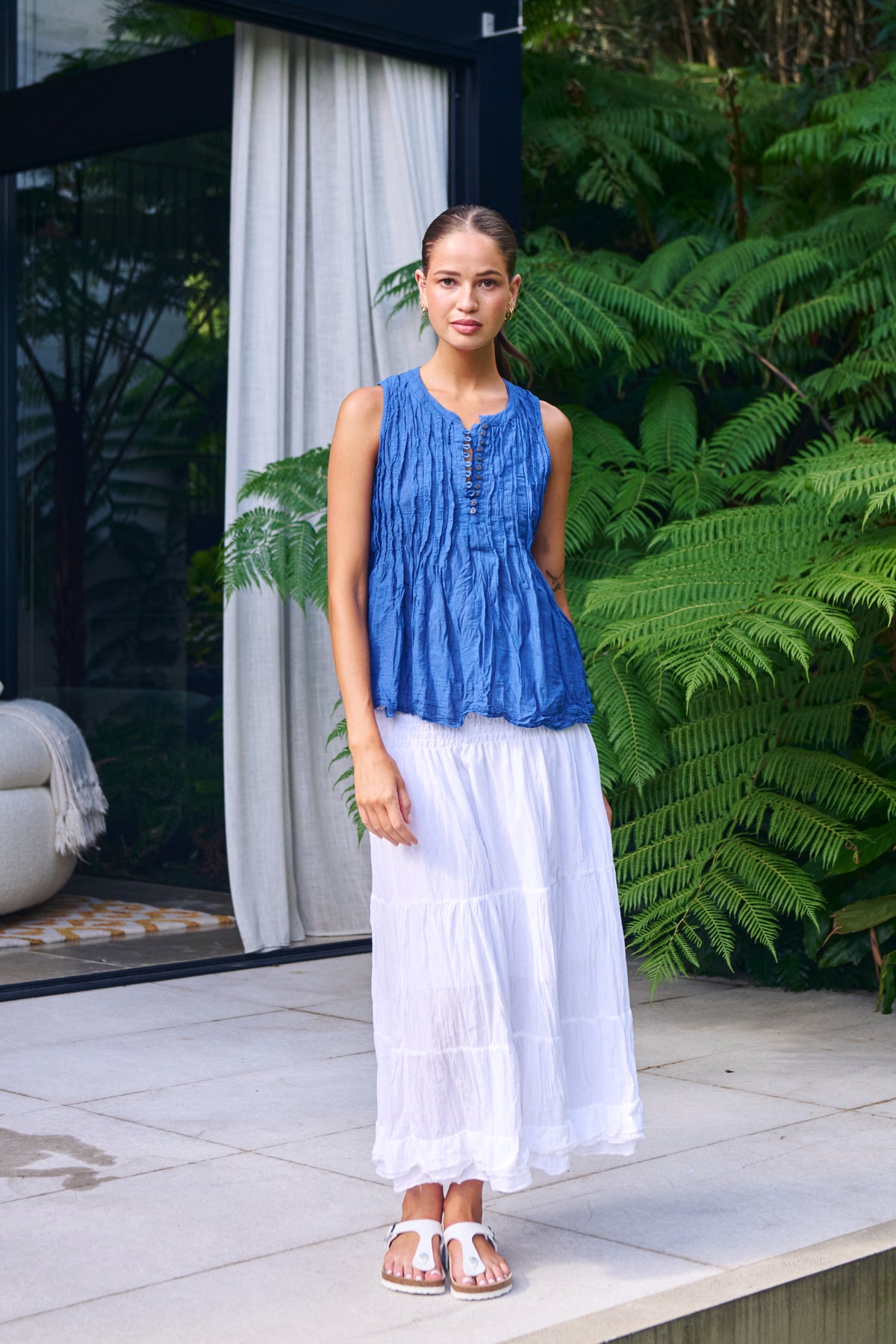 Cycladic top adds artisanal texture to your everyday wardrobe with its distinctive vertical pleating and flowing silhouette. This sleeveless blouse features a partial button placket and a subtly notched neckline for a feminine touch. Crafted from lightweight 100% crinkle cotton, it offers an airy feel, making it perfect for effortless layering or standalone sophistication.