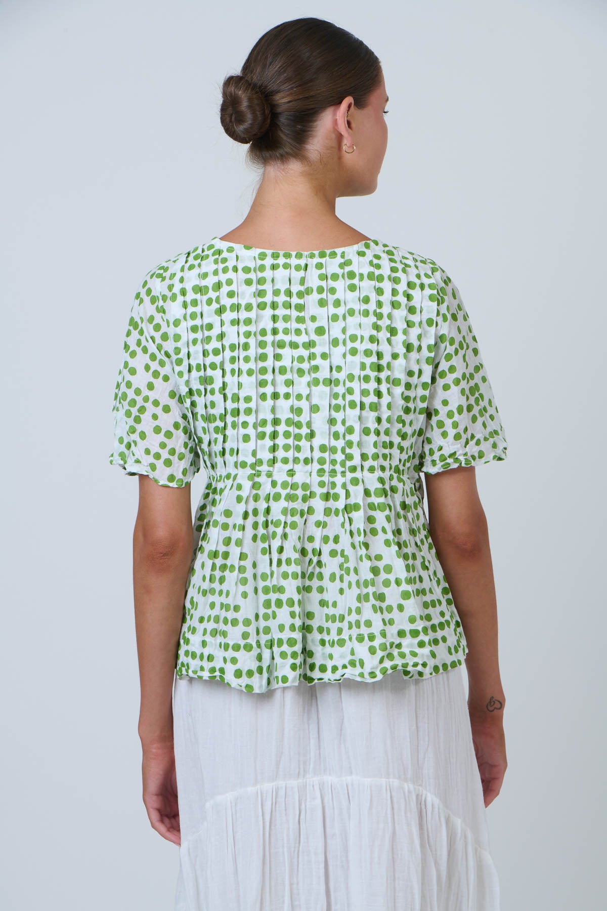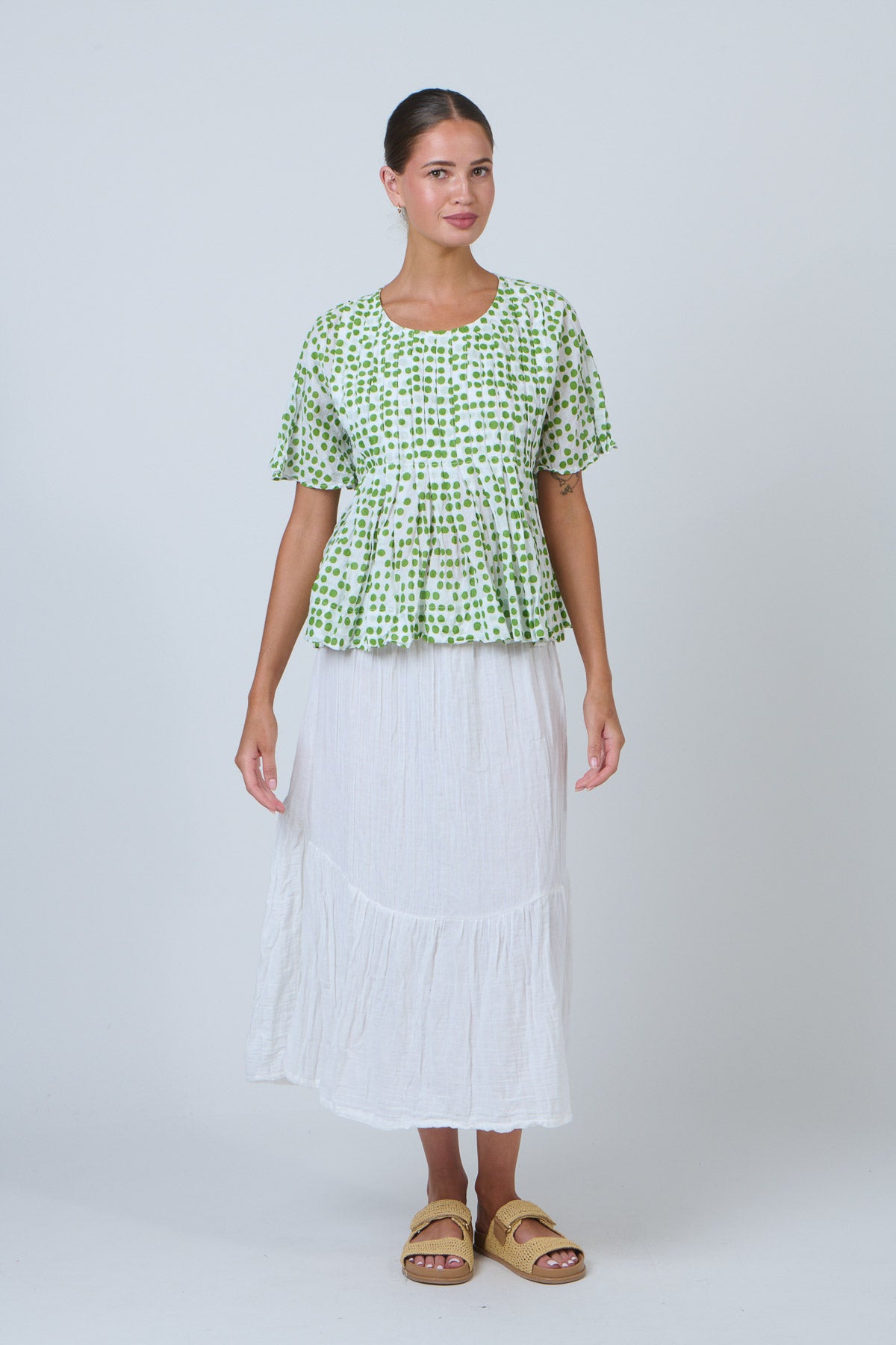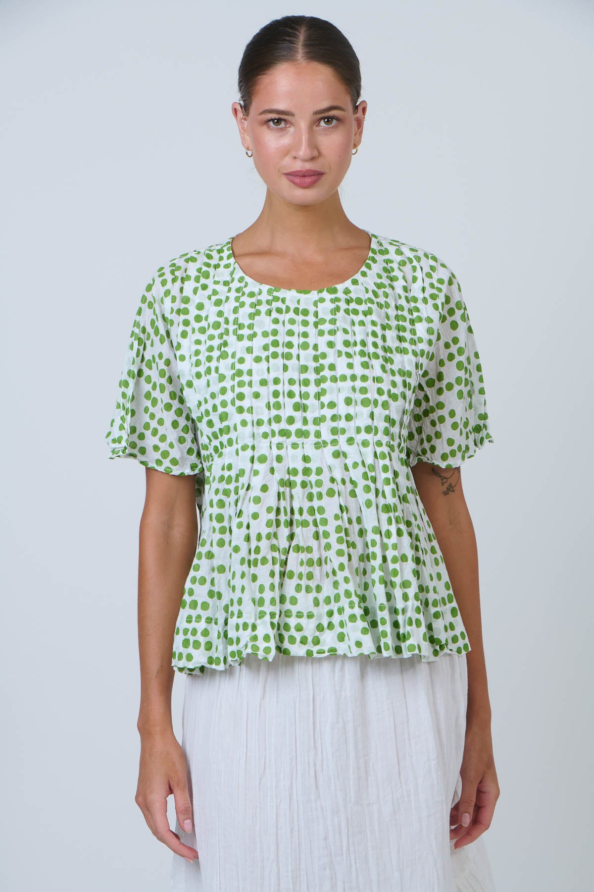 Light, breezy, and made to move with you. The P170 blouse features soft front pleats and flutter sleeves that bring a gentle flow to its silhouette. Crafted from 100% crinkle cotton, it’s finished with a scalloped hem for a subtle touch of charm—an easy favorite for sunny-day dressing.