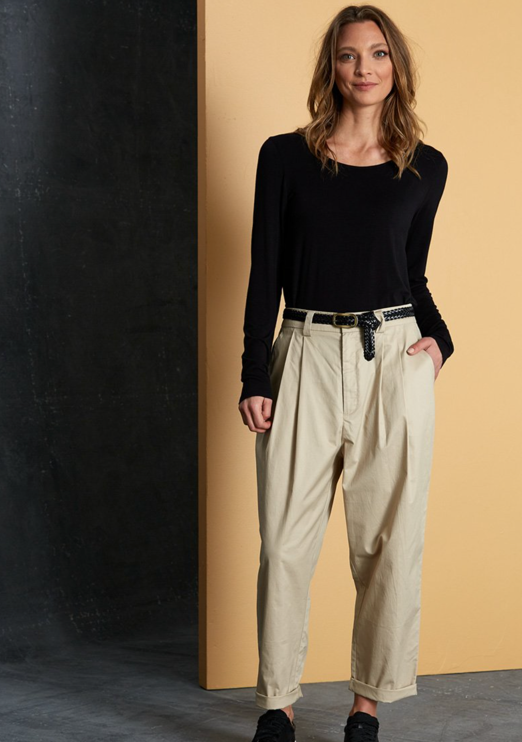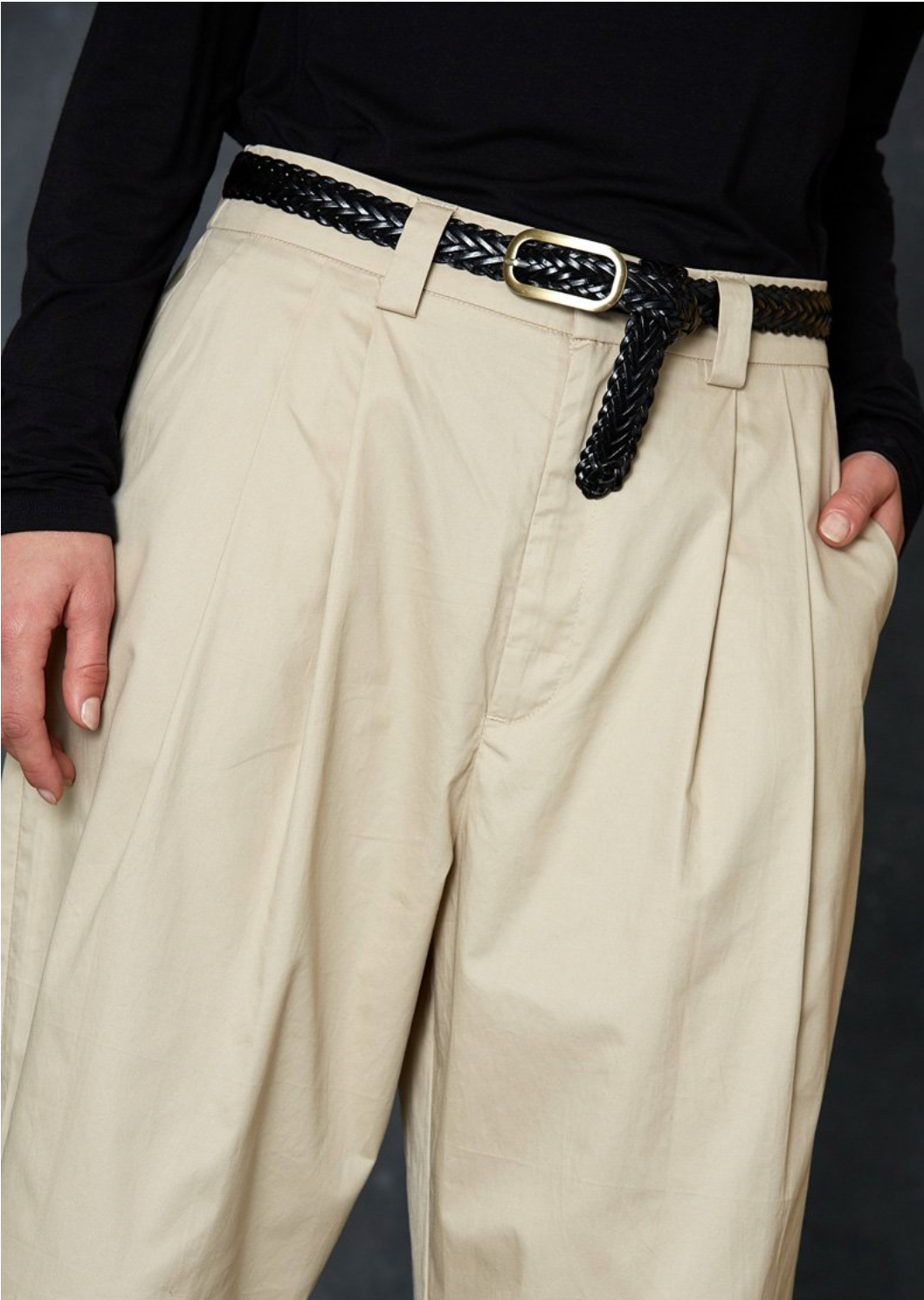 This relaxed fit design has been cut from 100% cotton and features a drop crotch, front pleats, belt loops, and an ankle-length rolled hem.