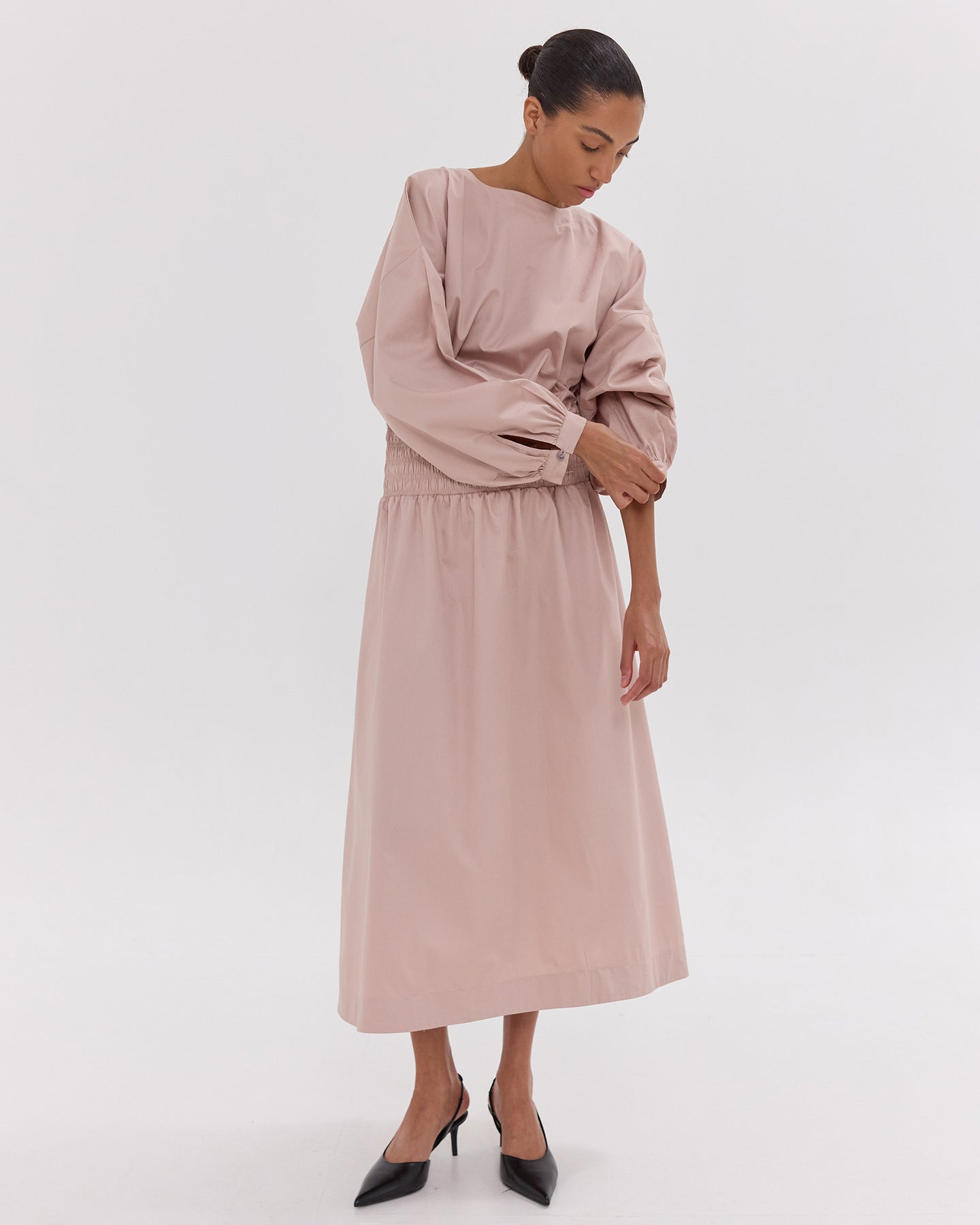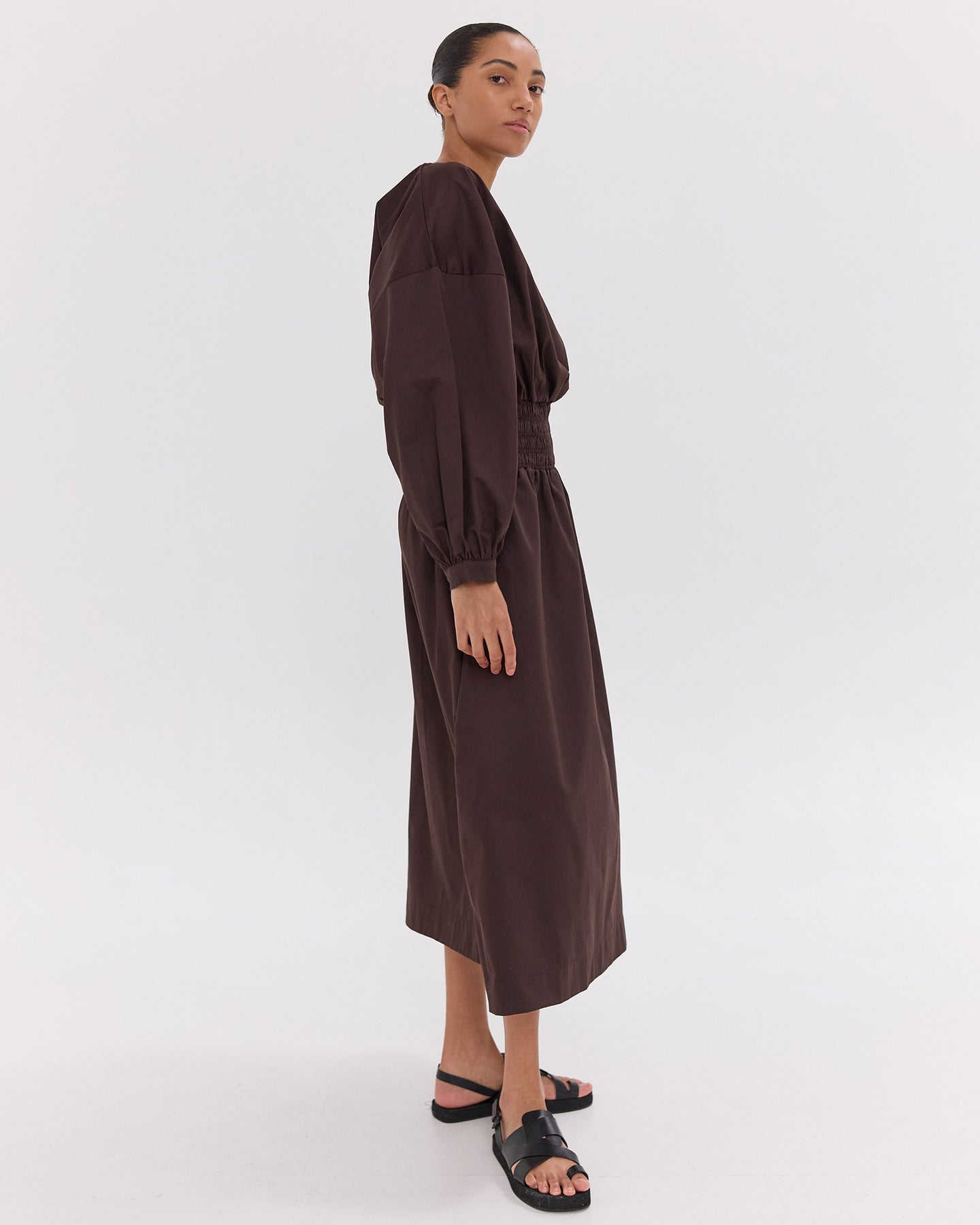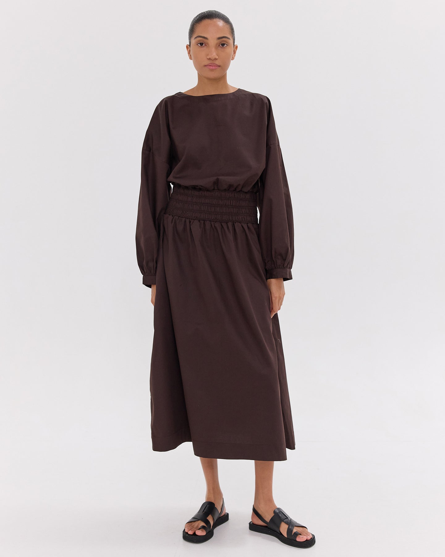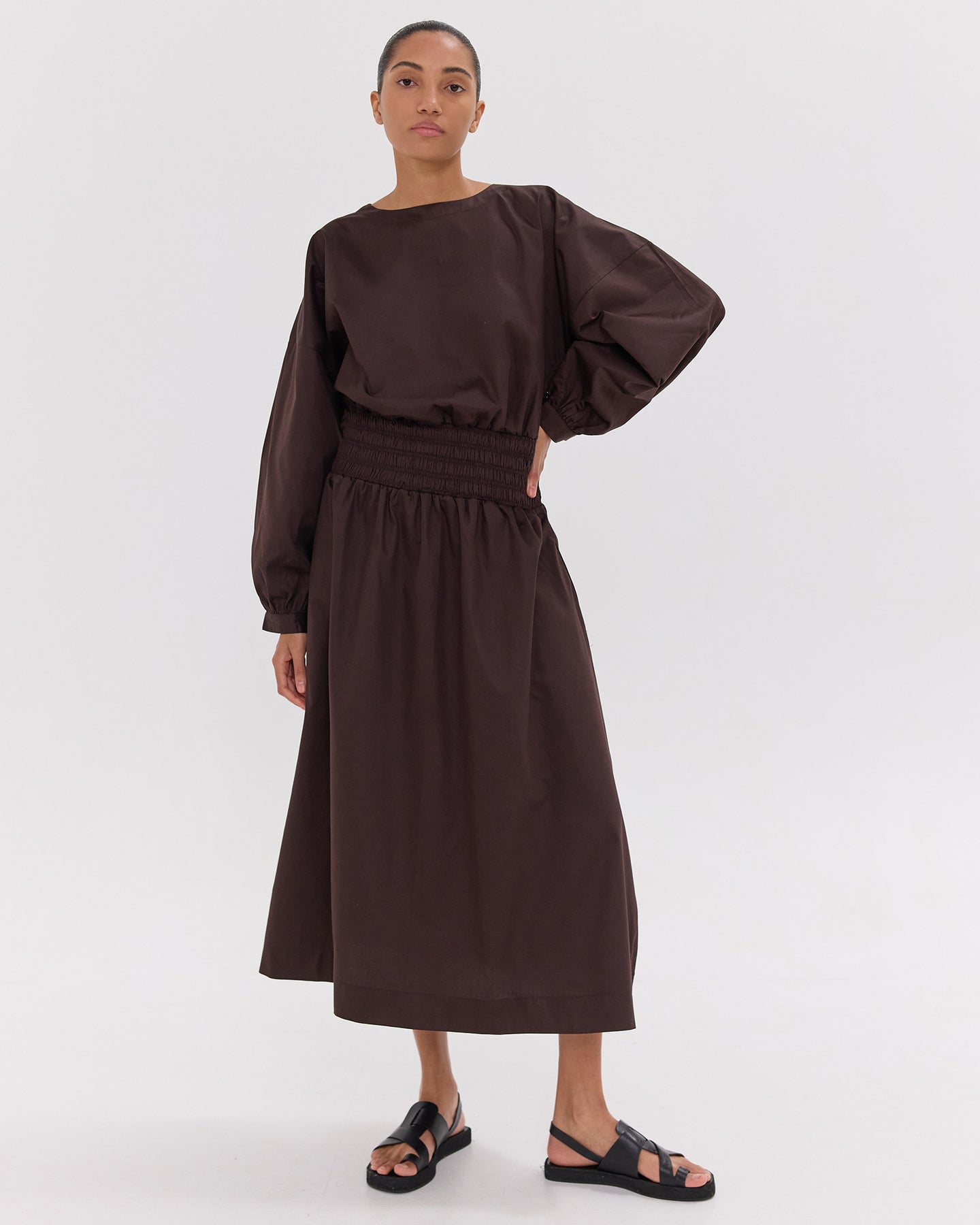 Made from 100% Giza cotton, this dress features a shirred bodice, voluminous billow sleeves, and a flowing midi skirt with pockets in the side seams. Light and breathable, it offers a flattering silhouette with a romantic, elevated feel.